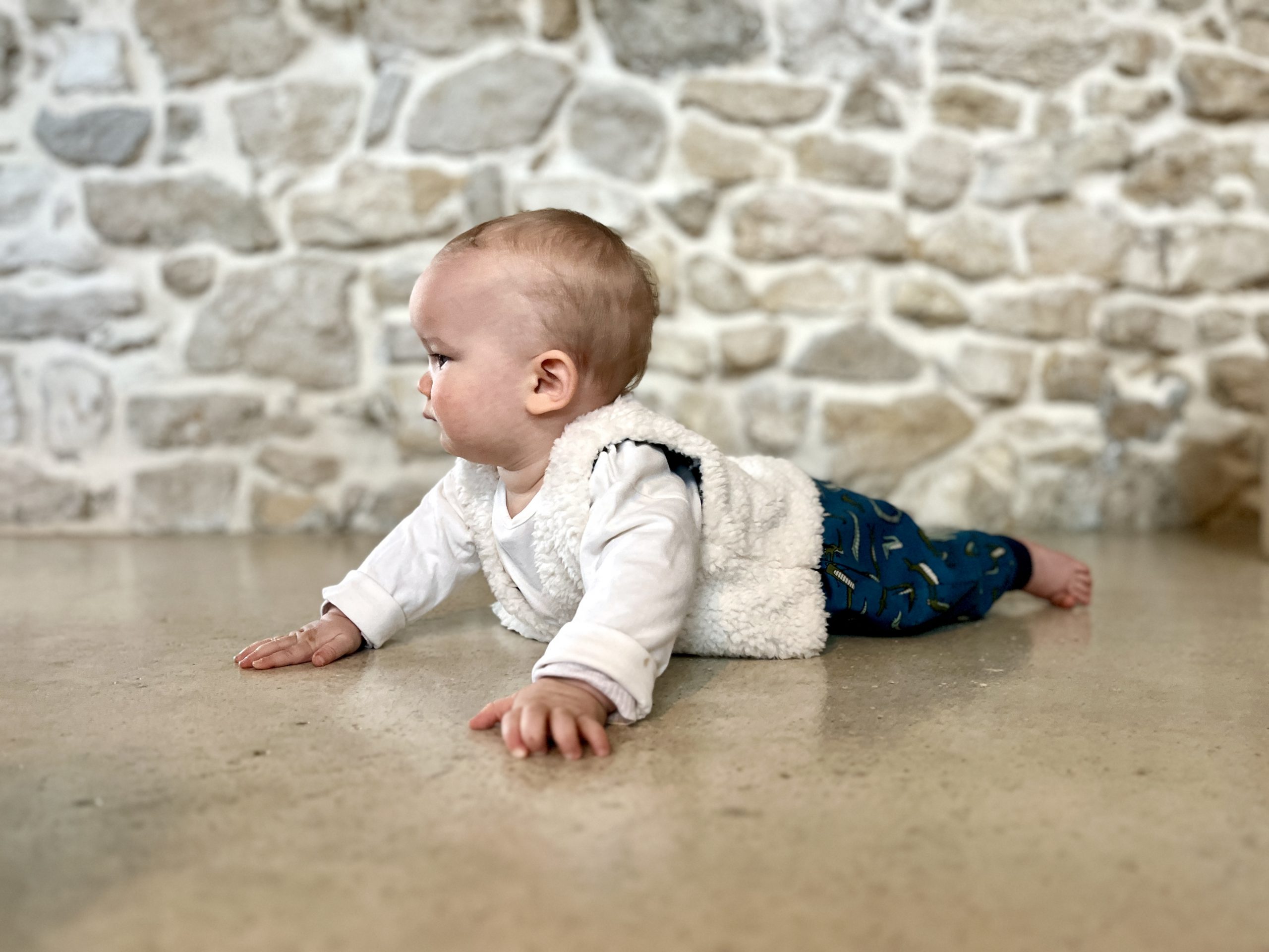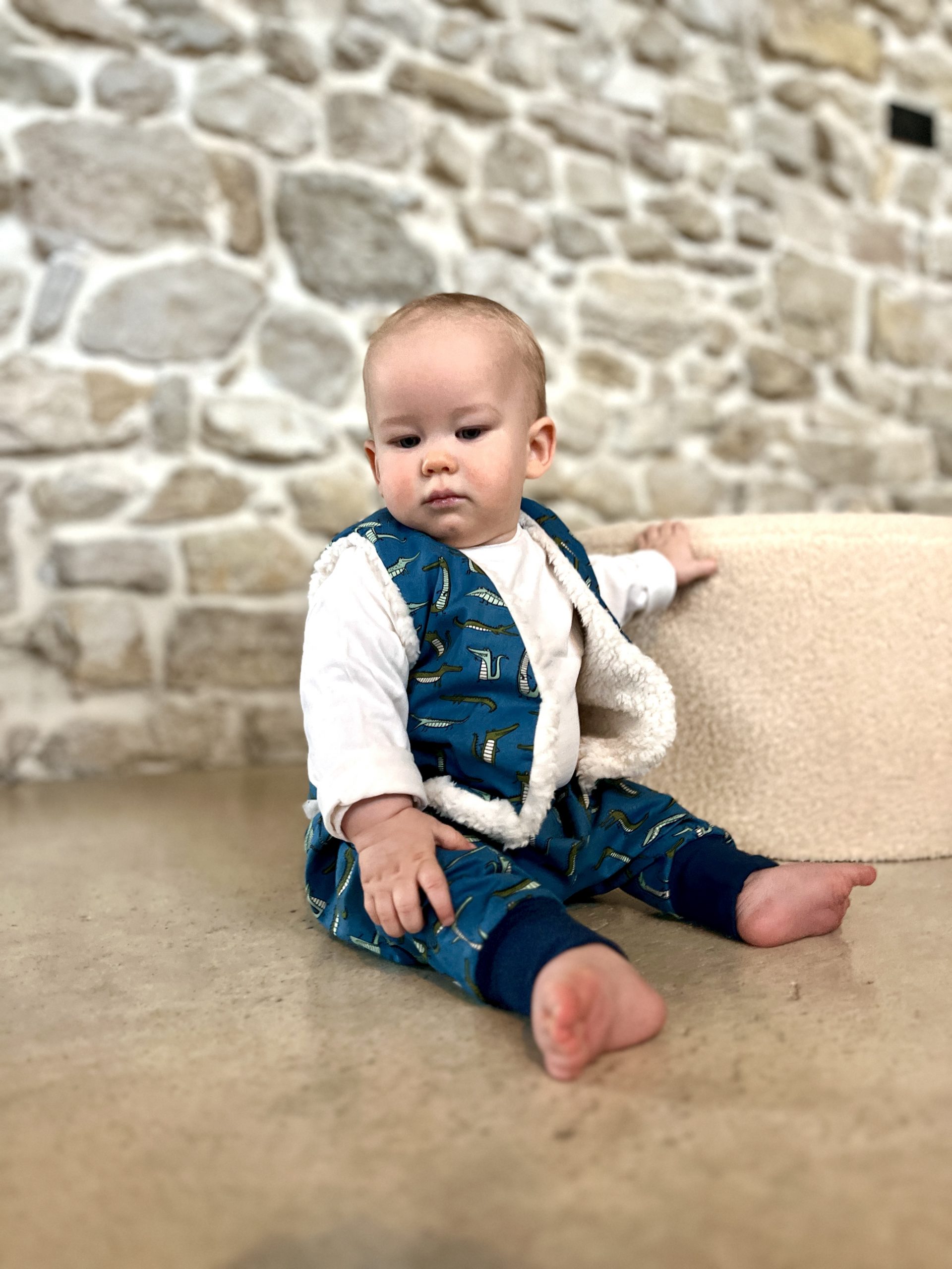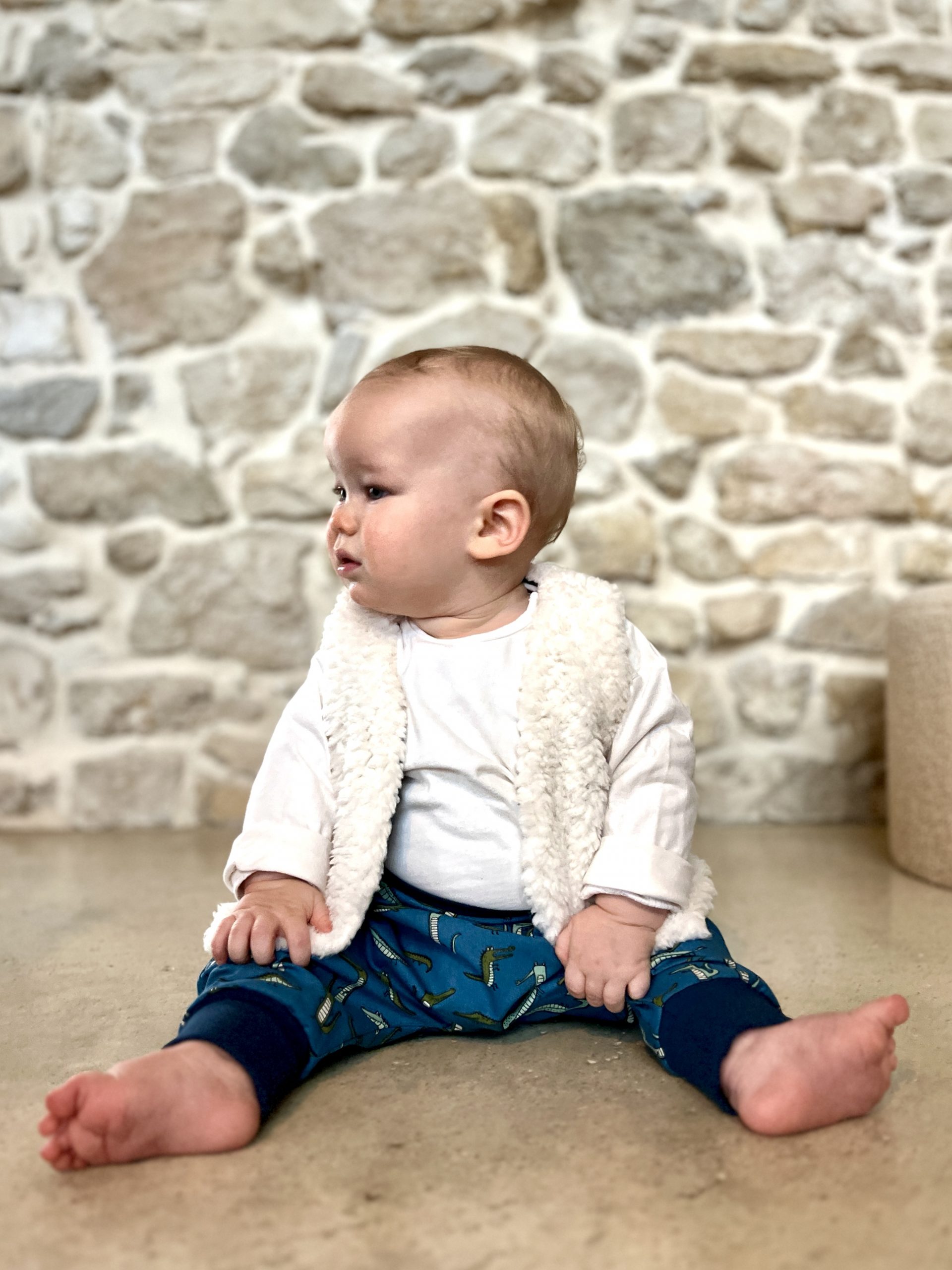 Le sarouel évolutif a une coupe large permettant le passage de la couche tout en étant confortable.